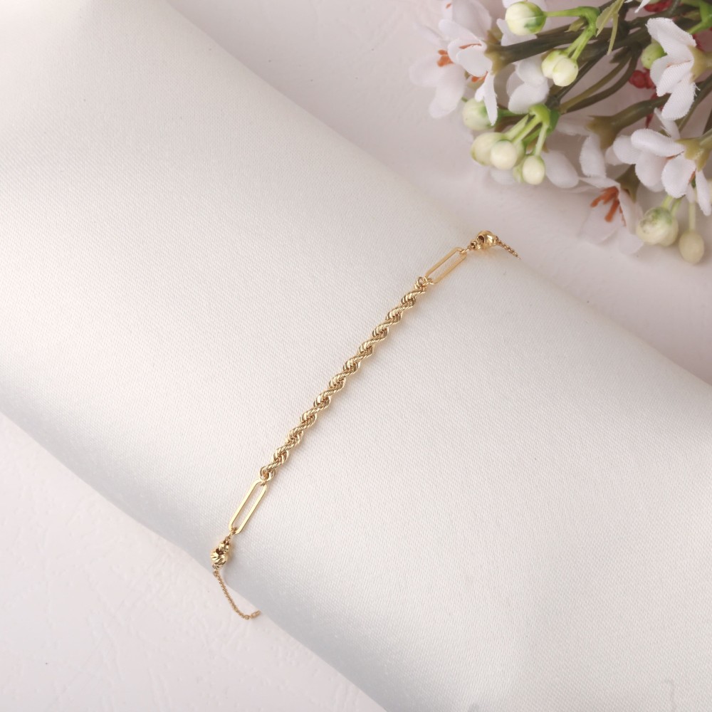 أسوارة مصنوعة من الذهب عيار 18، معدن ثمين ولامع. تتميز السوارة بتصميم أنيق وراقي، حيث تتكون من حلقات صغيرة متصلة ببعضها البعض لتشكل سلسلة جميلة على المعصم.